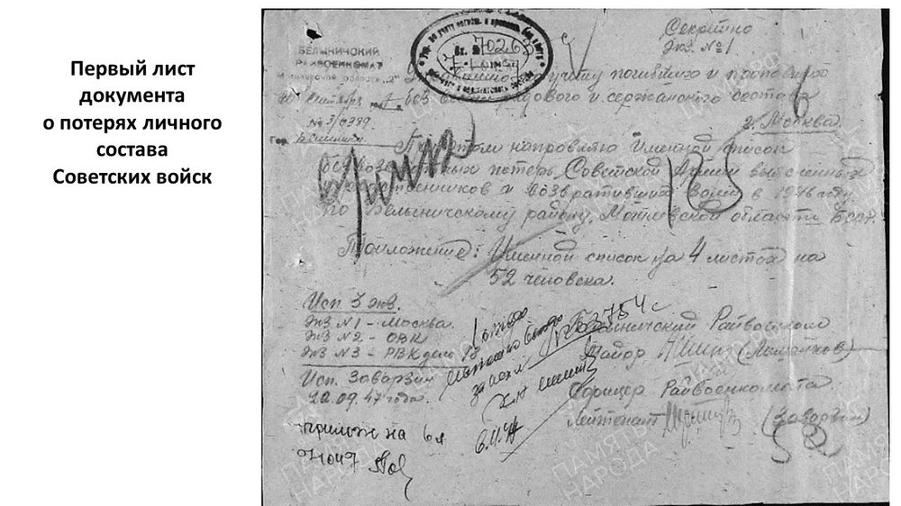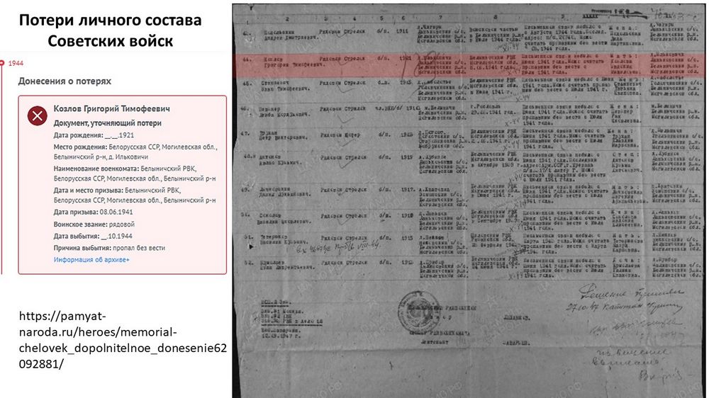 Из документа о потерях личного состава Советских войск: «Григорий Тимофеевич Козлов. Рядовой стрелок. Можно считать пропавшим без вести с июля 1941 года».